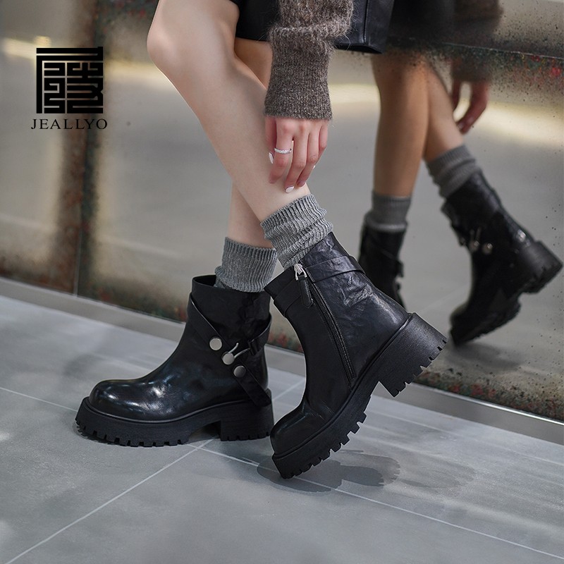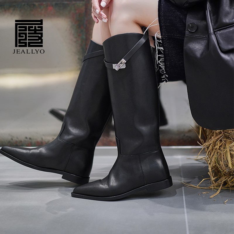 小牛皮平跟骑士靴
