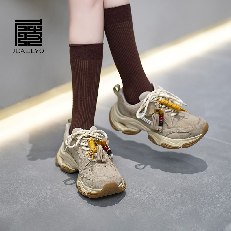 羊猄皮+网布厚底老爹鞋